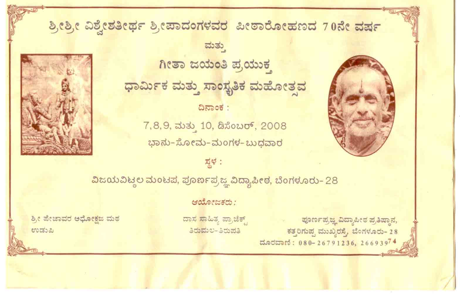 Gita Saaroddara Pravachanas - held on the occasion of GITA Jayanthi on 9th December 2008 in connection with Sri 108 Vishwesha Thirtha, Pejawara Adokshaja Matha's 70th Peetharohana function @ PPVP Bangalore |
