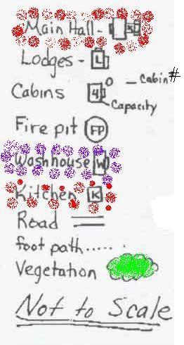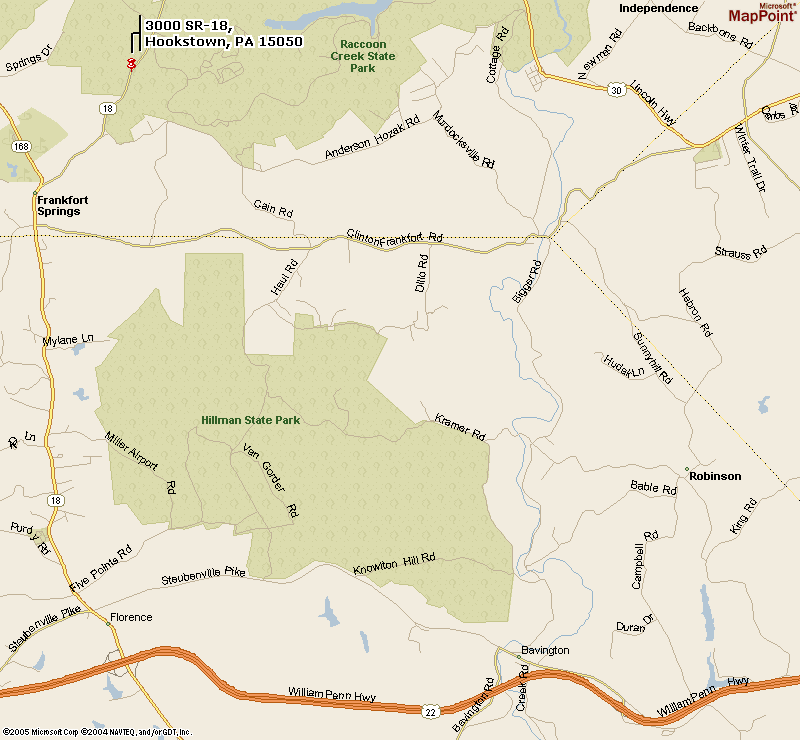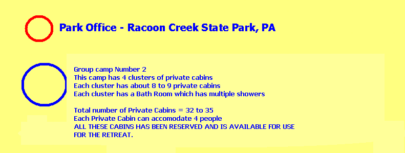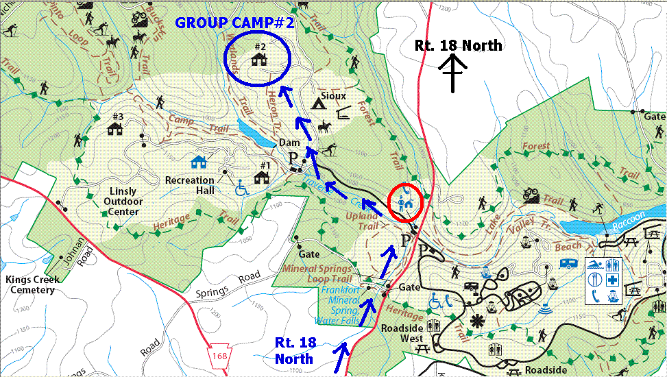 To get to the campsite, proceed to the Raccoon Creek State Park office, which is located on PA Route 18. (For those traveling north on Route 18, the park office will be on the left.) Turn onto the road that passes the park office. Travel a little more than one mile, and enter Group Camp #2 . Proceed straight ahead until you come the Dining Hall, which is the first large building on the left.